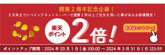 ベイシアネットスーパーで通算2回以上お買い物をされたお客様を対象に、3月中のお買い物の楽天ポイントが毎回2倍になるキャンペーンを開催いたします。