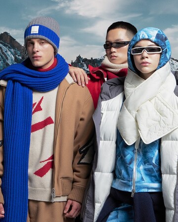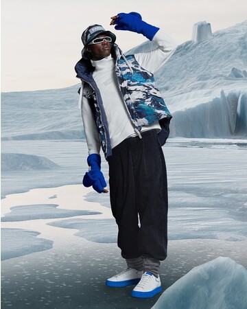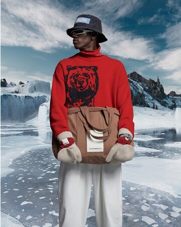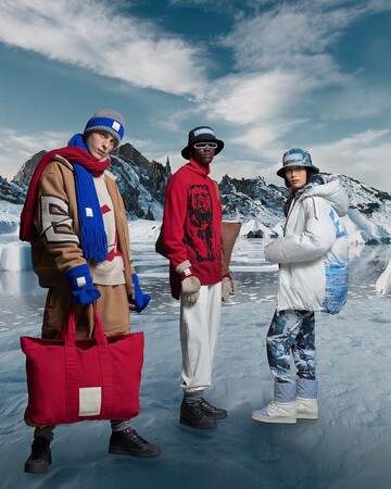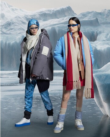 ラインナップは、ダウンジャケット、ボンバージャケット、プルオーバー、パーカー、スエットパンツ、トラウザーなどです。今季の特徴は、レッド、イエロー、エレクトリックブルーを基調とした、はっとするような生き生きとした色使いです。アウターやスエットに施された全面プリントは、氷河のイメージや氷が描かれ、また、エンポリオ アルマーニのアイコンでもあるイーグルも登場します。