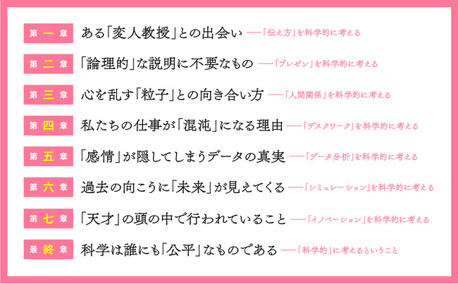 他にも、全8章の物語を通して、日々のビジネスに役立つ思考法を伝えていきます。読者は主人公の咲良に自身を重ねながら、「なんとなく」ではなく、事実やデータに基づいて知的で冷静に考えるためのモノの見方が身についていきます。