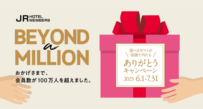 北海道から沖縄、台湾まで、個性豊かなホテルが集うJRホテルグループの会員プログラム「JRホテルメンバーズ(JRHM)」は2023年5月に会員数100万人を突破いたしました。これを記念し、日ごろからご愛顧をいただいている会員さまへの感謝の思いを込めて、2023年6月1日(木)~7月31日(月)の期間、「ありがとうキャンペーン」を開催いたします。 https://www.jrhotel-m.jp/special/thanks1million/1million_index.html