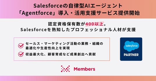 DX現場支援で顧客と共に社会変革をリードする株式会社メンバーズ(本社:東京都中央区、代表取締役社長:高野 明彦、東証プライム:2130、以下「メンバーズ」)は、Salesforceが2024年10月30日から提供を開始した自律型AIエージェント「Agentforce」について、2025年3月より、企業向け導入・活用支援サービスの提供を開始します。本サービスでは、Agentforceの初期導入コンサルティングから、設計・実装・運用、内製化、社員育成支援までを伴走支援します。