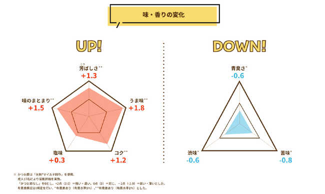 官能評価の結果、かつお節を入れることで、芳ばしさ、うま味、コク、塩味、全体的な味のまとまりがアップしたことが分かりました。一方で、野菜ならではの青臭さ、苦味、渋味が低減しました。