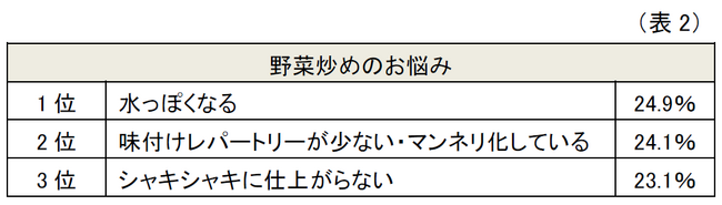 手軽に多くの野菜・栄養を摂れる料理として人気の野菜炒めですが、「水っぽさ」などのお悩みを抱えている方がいることも明らかになりました。(表2)