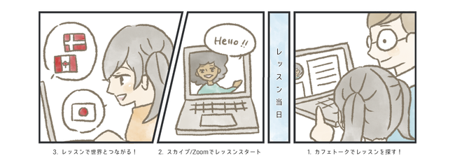「カフェトーク」とは、「いつもの生活に世界のスパイスを」をコンセプトに、スカイプやZoomを使って、90カ国を超える世界中の講師からマンツーマンのオンラインレッスンが受講できる、日本最大級のオンライン習い事レッスンサイトです。
