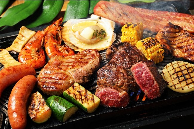 厚切り牛リブロース、湘南ポークロース、大山鶏もも、帆立貝と野菜のホイル焼き、有頭赤海老、ヤリイカ香草焼き、帆立貝と野菜のホイル焼き、焼き野菜4種