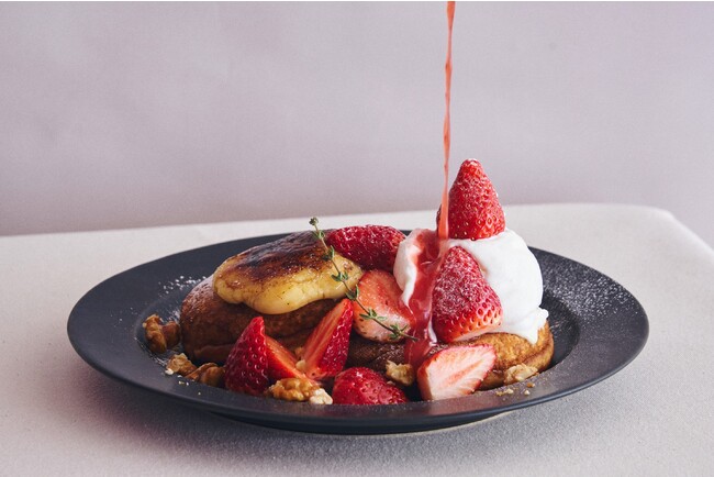 表面をパリッと香ばしくキャラメリゼしたブリュレクリームのパンケーキと、まるでショートケーキのような見た目のパンケーキ。2つの味を楽しめる贅沢なパンケーキには、甘くジューシーな“朝摘み完熟紅ほっぺ”いちごをたっぷりと。食べるたびに変化する、味のコントラストをお楽しみください。