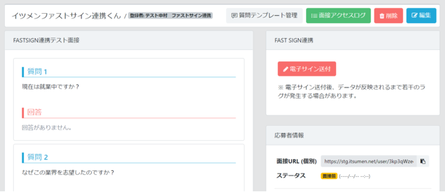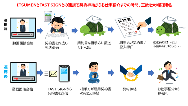 派遣応募者の取りこぼしを防ぐ!録画面接ツールITSUMEN(イツメン)、電子契約システムFAST SIGNとの連携でITSUMENから契約書類の送信が可能になり、面接から契約締結までがスムーズに。