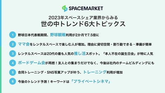 株式会社スペースマーケット(本社:東京都渋谷区、代表取締役社長:重松大輔、以下、スペースマーケット)は、あらゆるスペースを貸し借りできるプラットフォーム「スペースマーケット」における2023年の利用動向をまとめた「スペースシェア業界からみる世の中トレンド2023」を発表いたします。