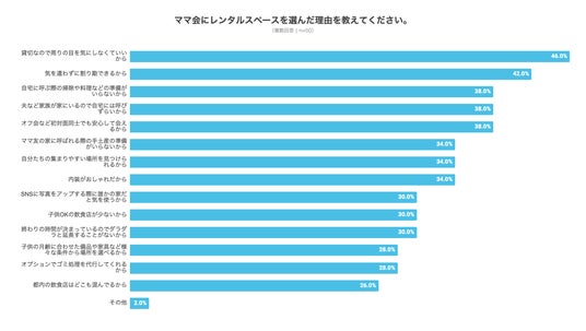 子育てママを対象にした実態調査では、約2人に1人はママ会をしたことがあるものの、約9割がママ会での「自宅に招く際の掃除」、「ママ友の家に招かれた際の手土産等の準備」などを面倒と感じた経験があることが明らかに。レンタルスペースでのママ会を選んだ理由を伺うと「貸切なので周りの目を気にしなくていい」、「気を使わず割り勘できる」、「掃除や料理などの準備がいらない」といった回答が上位に挙がりました。これらの理由からもママ会での“負”を解消するレンタルスペースが選ばれていることがわかります。