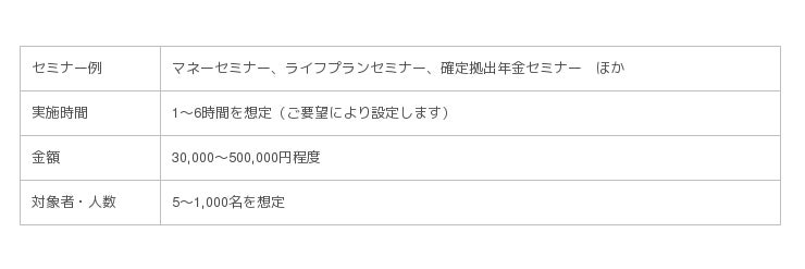 ■概要: 企業・一般向けライフプランセミナーや確定拠出年金セミナーなど教育研修サービスを開始