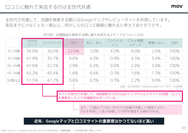 TableCheck社の調査によれば、飲食店検索で最も使われているのは「Googleマップ」と「グルメサイト(口コミ予約サイト)」となっています。