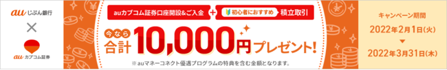 本キャンペーンは、auじぶん銀行経由でauカブコム証券の口座を開設されたお客さまが、auマネーコネクト優遇プログラムにて、はじめて1回5万円以上入金した場合に適用される現金5,000円の特典に加え、取引対象期間中にさらに投資信託またはプチ株(R)を積立取引により合計1万円以上買付(約定)いただくと5,000円を上乗せし、合計10,000円をプレゼントするものです。