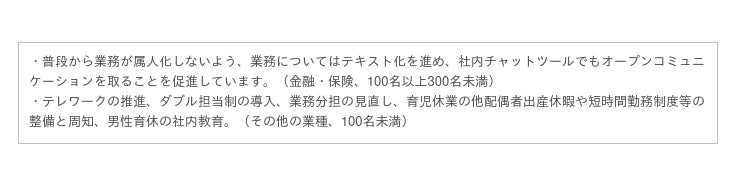 要因としては、仮に社内で声掛けや促進をすることで「取得率」が高まったとしても、取得日数は、職場全体で働き方改革をして、「仕事の属人化」を解消していなければ伸びないということが考えられます。なぜなら、仕事が属人化したままの企業では当事者が「周囲に迷惑をかける」という懸念から希望日数を取得しづらい環境になってしまうからです。