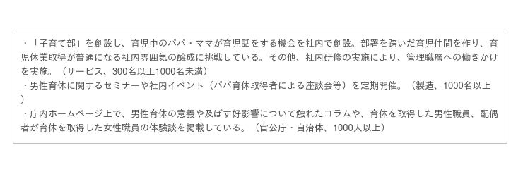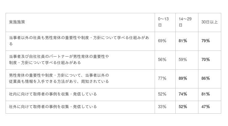 企業の取組について調べてみると、平均取得日数が14日以上の企業では、「当事者以外の従業員や、パートナーが男性育休の必要性について学べる仕組みがある」「社内外に向けて、取得者の事例を発信している」など、当事者以外への情報提供をしている割合が高いという結果になりました。育児休業を当事者の問題とせず、職場全体へ情報提供を通して男性育休取得への職場の理解や風土醸成をすることが取得日数向上に繋がっています。