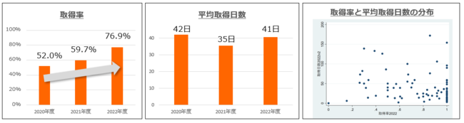 注:取得率、取得日数ともに3年間のデータがある企業・団体のみを集計。有効回答数はそれぞれ92、83。2022年度は回答時点での見込みの数値。