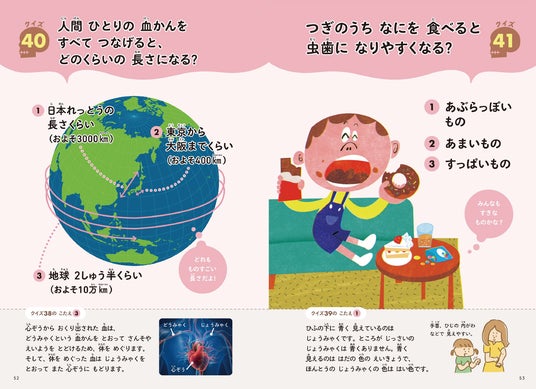 クイズは1ページ1問、合計で300問。すべて「かがくのお話」シリーズの既刊6冊で紹介した科学知識をもとにしたクイズ問題です。シリーズの読者なら「これ、知ってる!」と自信満々に答えられるクイズも多いかもしれません。もちろん、もとの書籍を知らないお子さんも大丈夫。科学オールジャンルからバランスよく出題しており、遊んで答えてくわしい解説文を読むことで、科学の基礎知識と科学への興味がぐんぐんと育つしくみです。