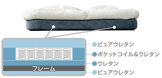 座面と背もたれはマットレスなどに使用されているポケットコイルを採用している為、しっかりと身体にフィットし点で支えてくれて、耐久性にも優れています。また、ウレタンもたっぷりしようしている為コイルの硬さを感じずやわらかい体あたりになっています。付属のクッションはふわっっと包み込まれるようなふっくらとしたボリュームで座り心地をより気持ちよく、快適にします。