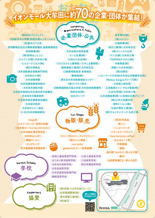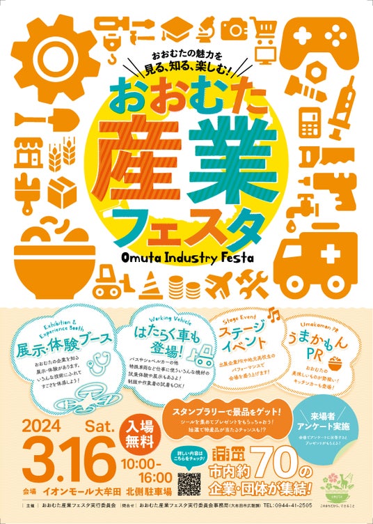 3月16日(土)に、大牟田市内の約70の企業・団体が集結して、大牟田の産業や企業を紹介する「おおむた産業フェスタ」を開催します。
