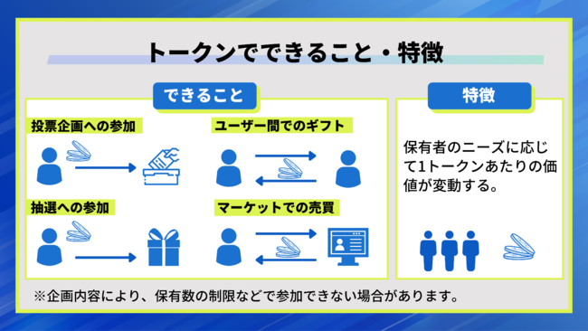 今後、トークン保有者は特別な特典を受けることができます。対象者が限られている抽選特典もあり、保有しているトークン数の割合によって当選確率が変動する企画もございます。