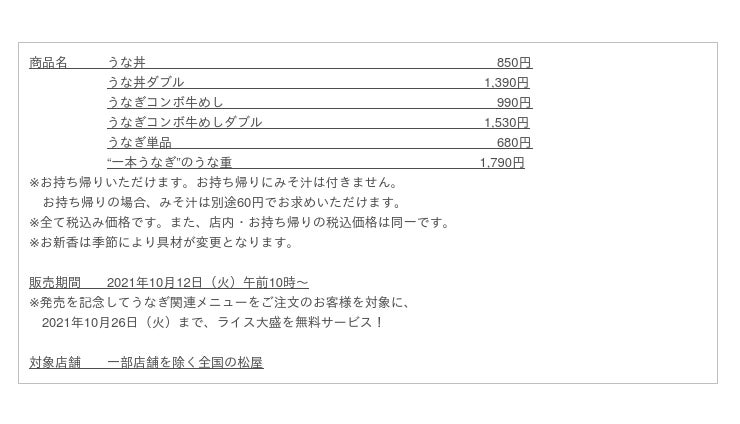 このたび松屋フーズ(本社:東京都武蔵野市、代表取締役社長:瓦葺一利)では、牛めし・カレー・定食・その他丼の「松屋」におきまして、2021年10月12日(火)よりうなぎ関連メニューを発売いたします。