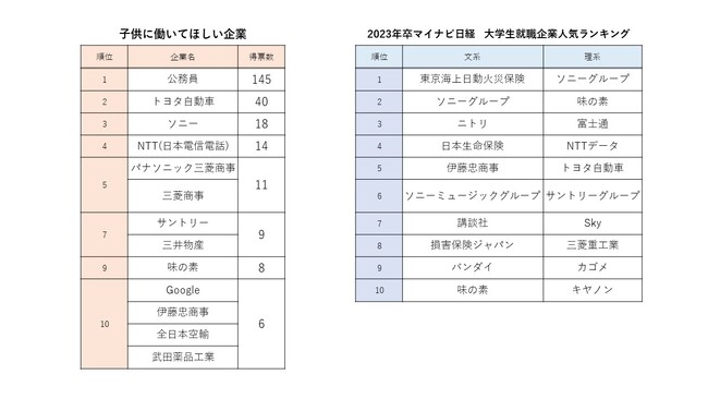 マイナビが行った調査によると、子供に入ってほしい企業の1位は「公務員」となり、その下には「トヨタ自動車」や「ソニー」といった大手民間企業が続きます。学生側にランクインしている企業を見ると、共通する企業名もあるものの、親との間に乖離が見られる側面もあります。