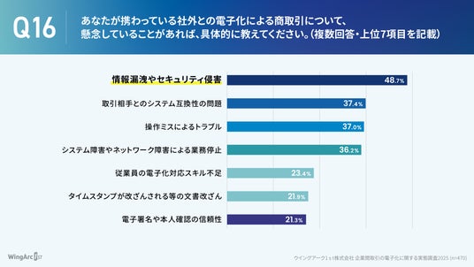 Q2で「社外との商取引には関わってない」以外を回答した方に、「Q16.あなたが携わっている社外との電子化による商取引について、懸念していることがあれば、具体的に教えてください。(複数回答)」(n=470)と質問したところ、「情報漏洩やセキュリティ侵害」が48.7%、「取引相手とのシステム互換性の問題」が37.4%、「操作ミスによるトラブル」が37.0%という回答となりました。