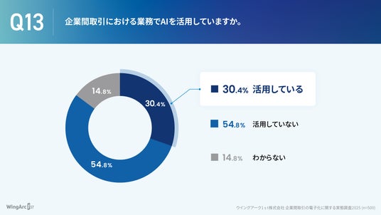 「Q13.企業間取引における業務でAIを活用していますか。」(n=500)と質問したところ、「活用している」が30.4%、「活用していない」が54.8%という回答となりました。