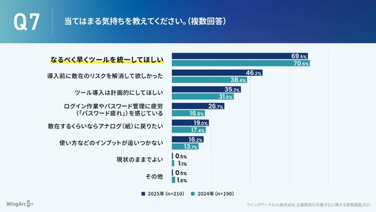 Q6で「とても散在している」「やや散在している」と回答した方に、「Q7. 当てはまる気持ちを教えてください。(複数回答)」(n=210)と質問したところ、「なるべく早くツールを統一してほしい」が69.5%、「導入前に散在のリスクを解消して欲しかった」が46.2%、「ツール導入は計画的にしてほしい」が35.2%という回答となりました。