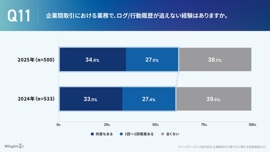 「Q11.企業間取引における業務で、ログ/行動履歴が追えない経験はありますか。」(n=500)と質問したところ、「何度もある」が34.8%、「1回~2回程度ある」が27.0%という回答となりました。