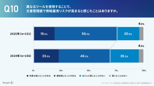 Q8で「異なるツールを使用している」と回答した方に、「Q10.異なるツールを使用することで、文書管理面で情報漏洩リスクが高まると感じたことはありますか。」(n=151)と質問したところ、「何度も感じたことがある」が19.2%、「数回感じたことがある」が56.3%という回答となりました。