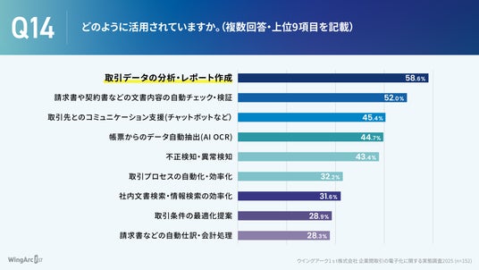 Q13で「活用している」と回答した方に、「Q14.どのように活用されていますか。(複数回答)」(n=152)と質問したところ、「取引データの分析・レポート作成」が58.6%、「請求書や契約書などの文書内容の自動チェック・検証」が52.0%、「取引先とのコミュニケーション支援(チャットボットなど)」が45.4%という回答となりました。