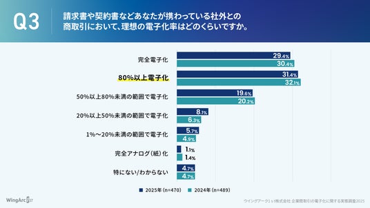 Q2で「社外との商取引には関わってない」以外を回答した方に、「Q3.請求書や契約書などあなたが携わっている社外との商取引において、理想の電子化率はどのくらいですか。」(n=470)と質問したところ、「完全電子化」が29.4%、「80%以上電子化」が31.4%という回答となりました。