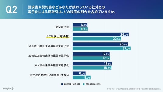 「Q2.請求書や契約書などあなたが携わっている社外との電子化による商取引は、どの程度の割合を占めていますか。」(n=500)と質問したところ、「完全電子化」が6.8%、「80%以上電子化」が26.0%という回答となりました。