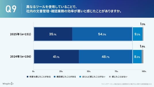 Q8で「異なるツールを使用している」と回答した方に、「Q9.異なるツールを使用していることで、社内の文書管理・確認業務の効率が悪いと感じたことがありますか。」(n=151)と質問したところ、「何度も感じたことがある」が35.1%、「数回感じたことがある」が54.3%という回答となりました。