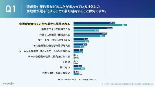 1.社外取引の電子化により期待すること、前年と同じく「負担がかかっていた作業からの解放」が最多