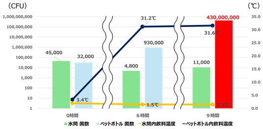 2025年7月に実施した「サーモス 飲料・容器別 生菌数に関する調査(*)」によると、室温35℃で静置したペットボトル飲料は、飲料温度が31.9℃まで上昇しました。同条件でスポーツドリンクの菌数を測定したところ、9時間後にはペットボトルで約4億3千万 CFUに達したのに対し、保冷ができる真空断熱構造の水筒では約1万1千 CFUにとどまり、その差は約3万倍に及びました。