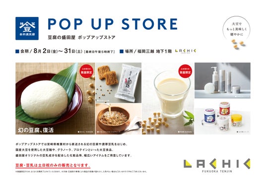 豆乳化粧品・大豆食品等を販売する豆腐の盛田屋(株式会社JIMOS 福岡県福岡市)は、福岡三越地下1階ラシックにて、豆腐の盛田屋ポップアップイベントを2024年8月2 日(金)~8月31日(土)まで1ヶ月限定で開催いたします。宮崎県椎葉村でつくった豆腐や豆乳の試食販売に加え、豆乳スキンケアや大豆を使った食品も展開いたします。