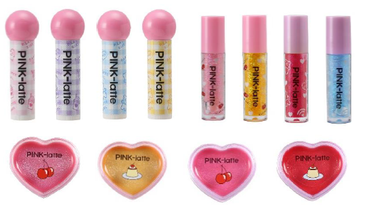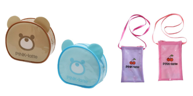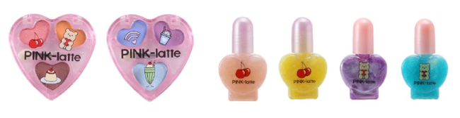 「ピンク ラテ」 くまポーチ 全2種、ショルダーポーチ 全2種、クリアキューブポーチ 全5種、シュシュ 全4種、ヘアゴム 全2種、リップクリーム 全4種、水溶性ネイル 全4種、リップグロス(ケース) 全4種、リップグロス(スティック) 全4種、ネイルチップ 全1種、アイシャドウパレット 全2種