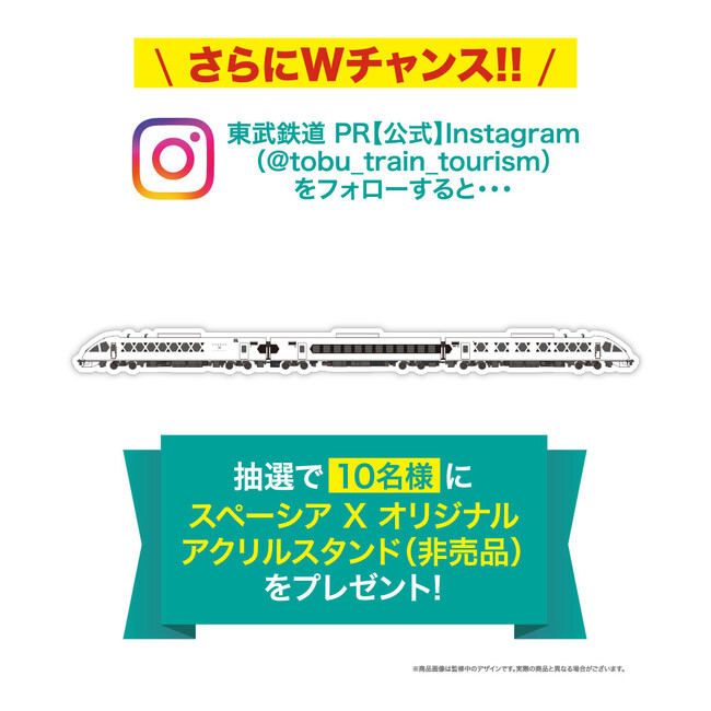 さらに、東武鉄道PR【公式】Instagram(@tobu_train_tourism)をフォローしていただいた方にはスペーシア Xオリジナルアクリルスタンド(非売品)が当たるWチャンスもございます!