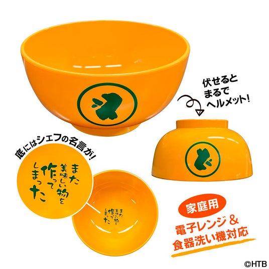 光沢のある黄色に、あえて逆さまに入った○どロゴは思わずかぶってしまいそうになるほどヘルメットそっくり!丼に自分だけの命のスープで作った「ヘルメットラーメン」、椀にはご飯を盛って「ヘルメットラーメンライス」にしたり、好きな丼物と共にお味噌汁を入れたり、丼とセットで使うとより楽しい!完食すると底には「また美味しい物を作ってしまった」の文字が。