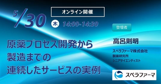 スペラファーマ株式会社(本社:大阪府大阪市、代表取締役社長:岩城 慶太郎)は、2024年5月30日(木)に「原薬プロセス開発から製造までの連続したサービスの実例」についてウェビナーを開催いたします。