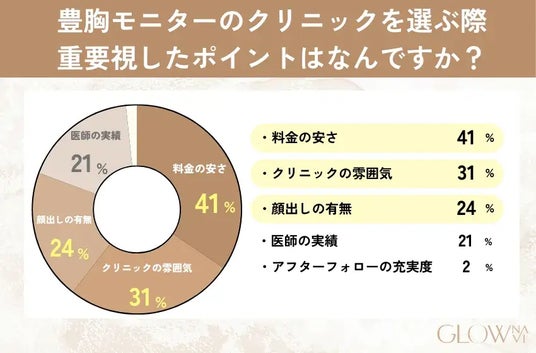 - 豊胸モニターのクリニック選びの決め手は「料金の安さ」が最多(41%)