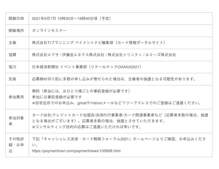 2021年6月7日に開催される「キャッシュレス決済・カード戦略フォーラム2021」にて、下記内容で講演させていただきます。