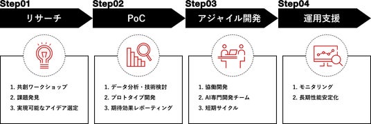 法人向けChatGPT活用プラットフォーム「法人GAI」をはじめとする各種のAIサービスの開発実績やコンサルティング知見、2018年より提供しているデジタル人材採用・育成支援プラットフォーム「Track」を通じて築いた300人以上のAI人材コミュニティを活用することで、AIサービスのリサーチから実装までのバリューチェーンを総合的にサポートすることが可能です。