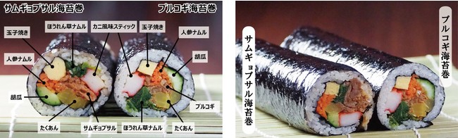 牛肉を甘く味付けした「プルコギ海苔巻」も、豚肉を香ばしく焼いた「サムギョプサル海苔巻」も、ほうれん草ナムルや人参ナムルの他、玉子焼き、カニ風味スティックなどを1本1本丁寧に巻いたボリューミーで食べ応える太巻きに仕上げました。
