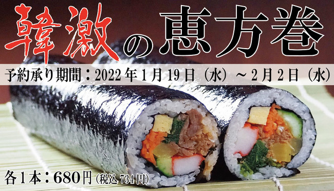 養老乃瀧株式会社(東京都豊島区、代表取締役 矢満田 敏之)は、2022年の節分を楽しく笑顔を迎えていただくため、グループ業態の『大衆食堂 韓激』の『恵方巻』2種の事前予約を開始いたしました。