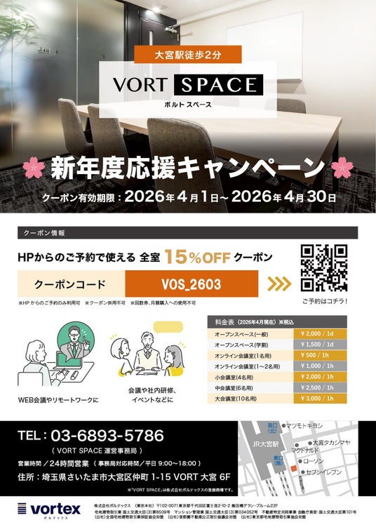「区分所有オフィス(R)」を主軸に資産形成コンサルティングを行う株式会社ボルテックス(東京都千代田区 代表取締役社長 兼 CEO 宮沢 文彦、以下当社)は、当社が運営するサテライトシェアオフィス「relark(リラーク)大宮」について、運営体制の変更に伴い、2026年4月1日(水)より施設名称を「VORT SPACE(ボルトスペース) 大宮」へ変更するとともに、終日非対面運営へ移行いたします。