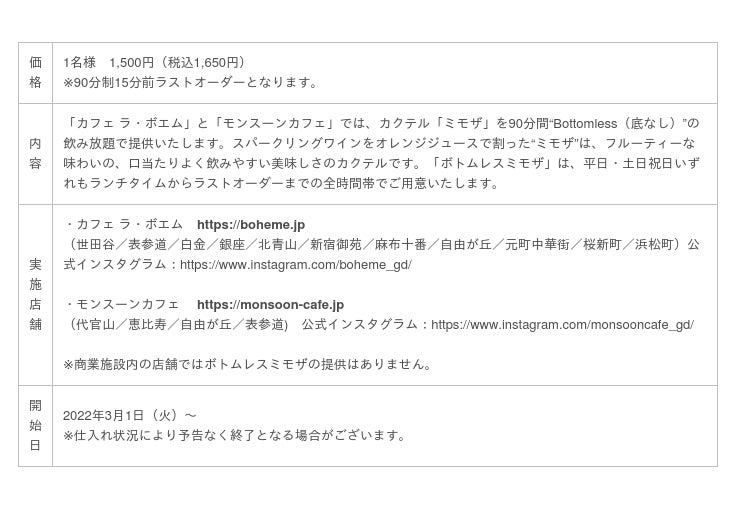日本国内では、3月1日(火)より、「カフェ ラ・ボエム」と「モンスーンカフェ」で、“ボトムレスミモザ”を提供いたします。“Bottomless”は、その名のとおり“底なし”の意味で、 90分飲み放題1,500円(税込1,650 円)で、存分にミモザをお楽しみいただけます。カジュアルなデートや、ゆっくりと寛ぐ週末のブランチタイムにぴったりの、お洒落でお得な飲み放題プランです。アメリカ西海岸・ロサンゼルスでも話題の“ボトムレスミモザ”で、海外バカンス気分はいかがでしょうか。皆様のご利用をお待ちしております。