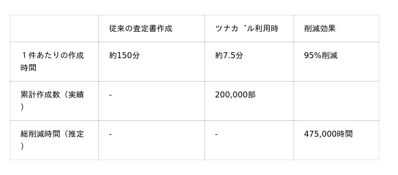 (*2)不動産仲介現場において、1件の査定書作成にかかる時間は平均150分(120~180分)。ツナガルオンライン査定を活用することで、この作業時間は平均7.5分(~10分)へと大幅に短縮。 算出式:(150分 - 7.5分) ×200,000部 = 28,500,000分(475,000時間)
