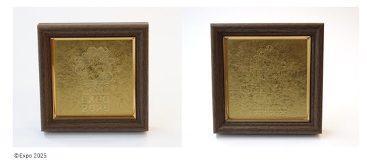 百年以上の伝統を受けつぐ職人たちが1万分の1ミリ程度の厚さの箔の上に、印刷ではなく凹凸のみで大阪・関西万博デザインを表現しました。1号色は、金箔の色のひとつで純金が97.666%、純銀が1.357%、純銅が0.977%の合金でできていて、金の品位は99.99%とされています。煌びやかで存在感のある逸品、お部屋のインテリアとしてもお楽しみいただけます。